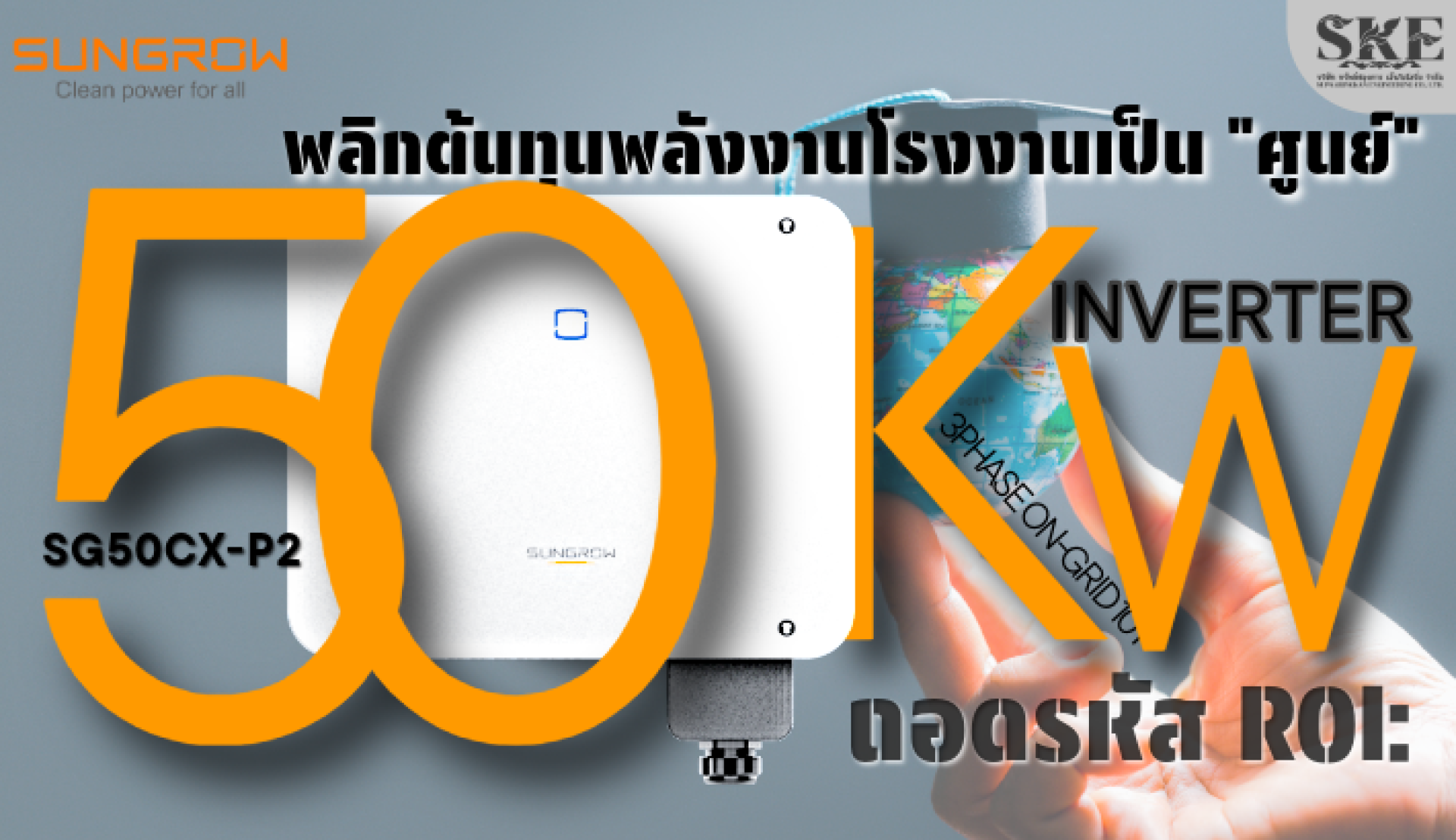 ค่าไฟฟ้าคือต้นทุนดำเนินงาน (OPEX) มหาศาลที่กัดกินกำไรของโรงงานทุกเดือน แต่จะเป็นอย่างไรถ้าเราสามารถ "หยุด" ค่าใช้จ่ายส่วนนี้ในช่วงกลางวันได้อย่างถาวร? การลงทุนในระบบ Solar Rooftop ที่ใช้หัวใจเป็นอินเวอร์เตอร์ประสิทธิภาพสูงอย่าง Sungrow SG50CX-P2 คือคำตอบ บทความนี้ SKE จะมาถอดรหัสการคำนวณผลตอบแทนจากการลงทุน (ROI) ให้เห็นชัดๆ ว่าโรงงานของคุณจะไปถึงจุดที่ "ต้นทุนพลังงานตอนกลางวันเป็นศูนย์" ได้ในเวลากี่ปี