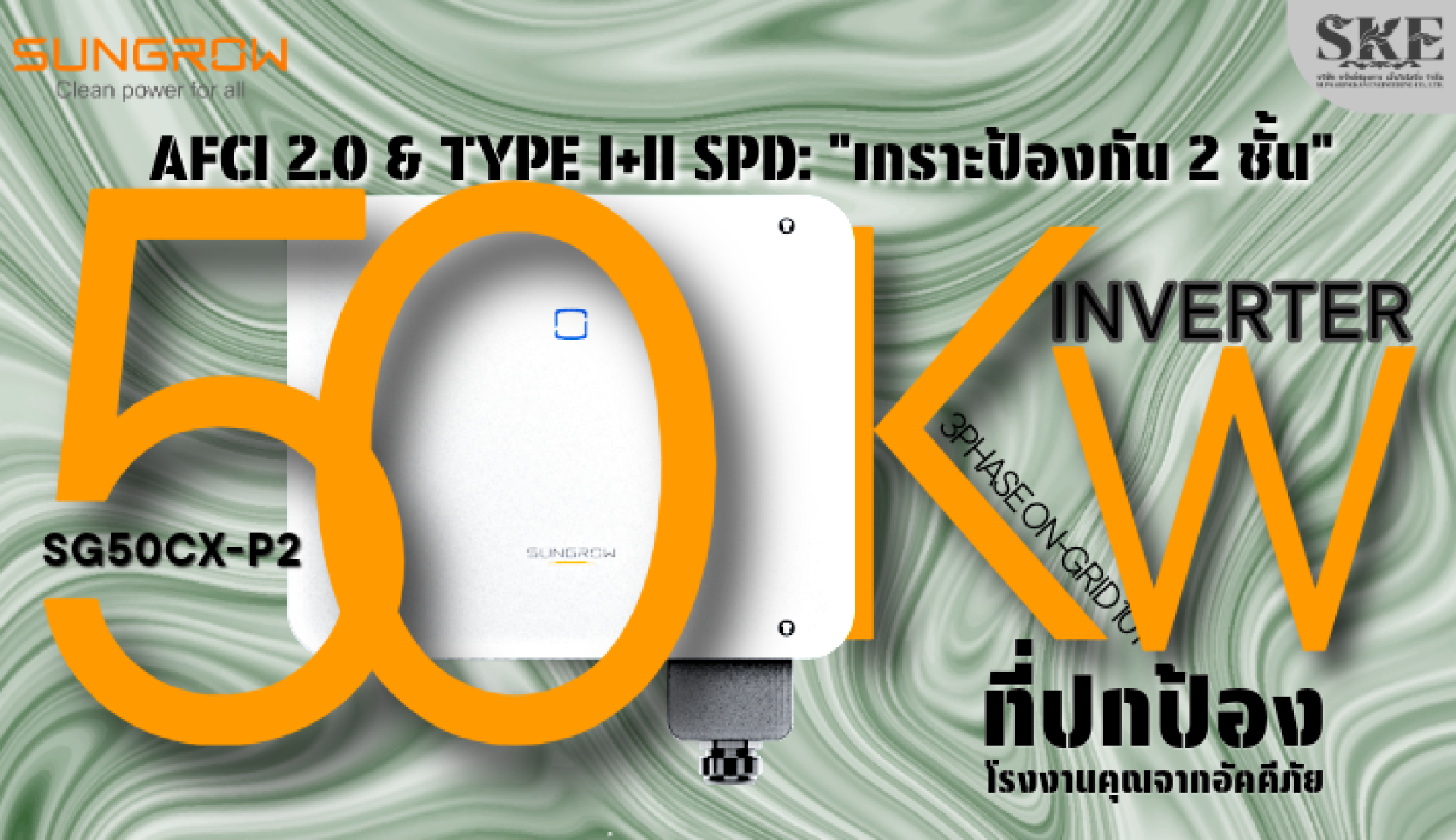 ความปลอดภัยคือหัวใจสำคัญสูงสุดของการลงทุนติดตั้ง Solar Rooftop ขนาดใหญ่ในโรงงาน Sungrow SG50CX-P2 ไม่เพียงแต่โดดเด่นด้านประสิทธิภาพ แต่ยังมาพร้อม "เกราะป้องกันอัคคีภัย 2 ชั้น" ที่ทำงานร่วมกันอย่างสมบูรณ์แบบ นั่นคือระบบ AFCI 2.0 และ SPD Type I+II บทความนี้ SKE จะมาเจาะลึกว่าเกราะทั้งสองชั้นนี้ปกป้องการลงทุนและโรงงานของคุณได้อย่างไร