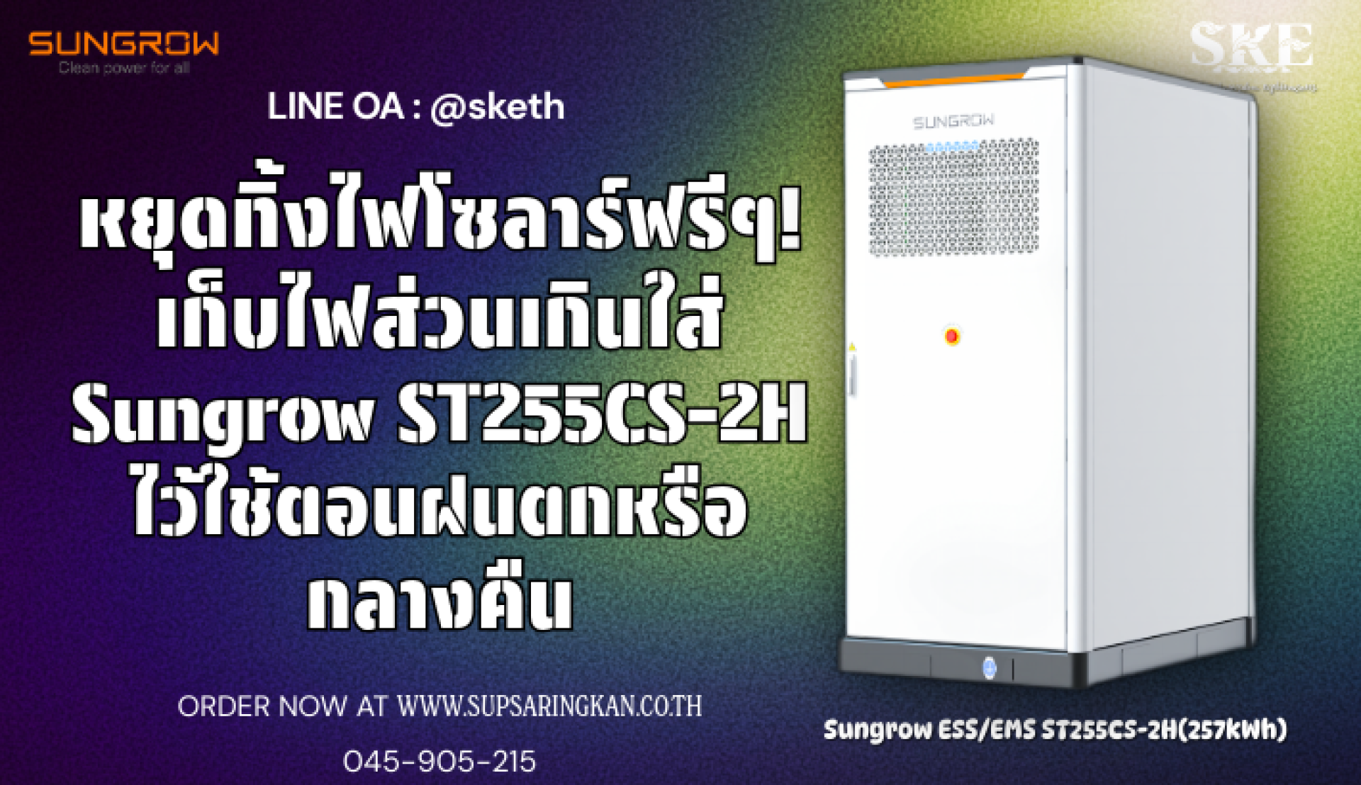 หยุดทิ้งไฟโซลาร์ฟรีๆ! เก็บไฟส่วนเกินใส่ Sungrow ST255CS-2H ไว้ใช้ตอนฝนตกหรือกลางคืน | SKE Solar