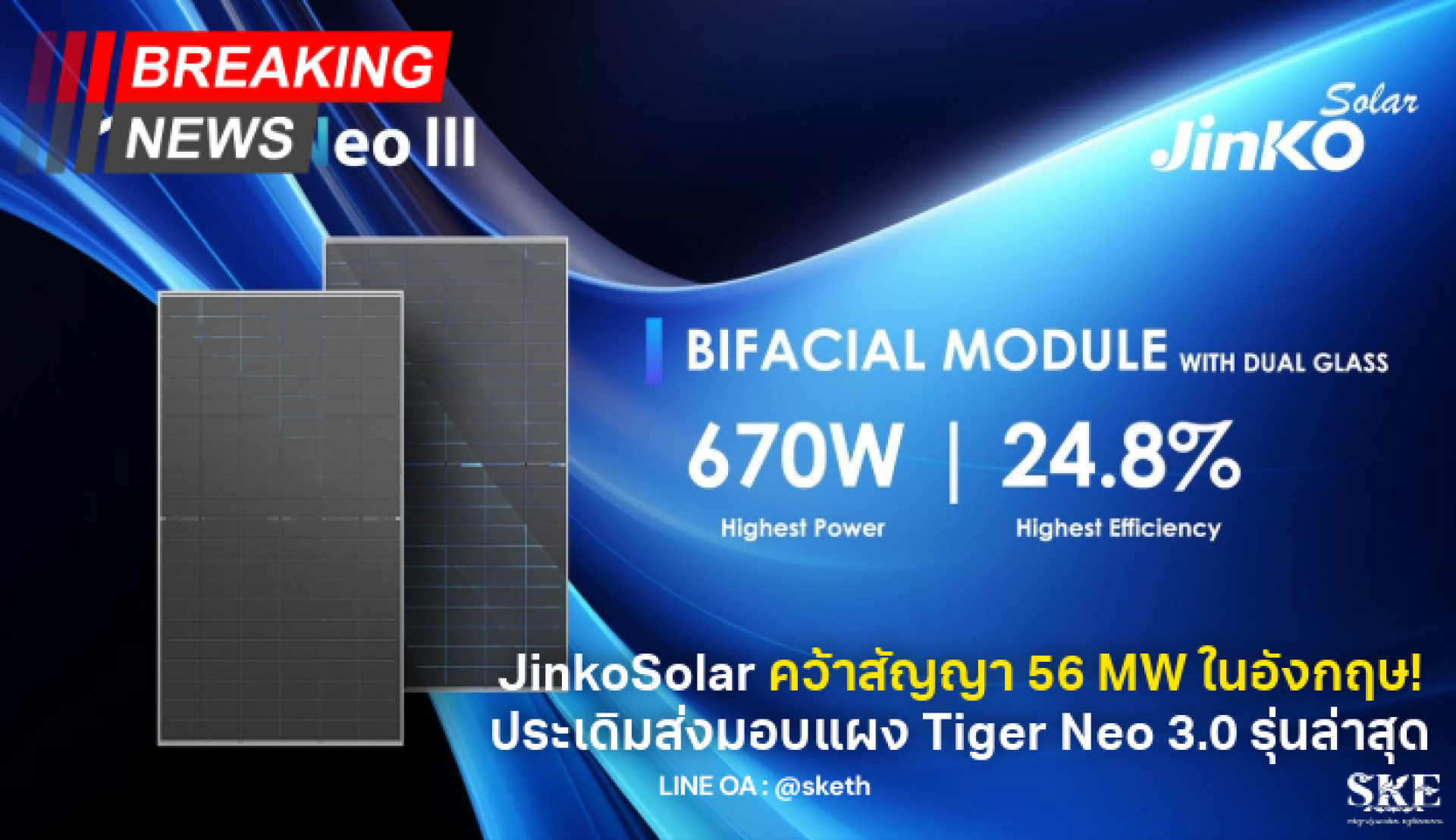 SKE Solar พร้อมส่งมอบแผง JinkoSolar Tiger Neo ของแท้
