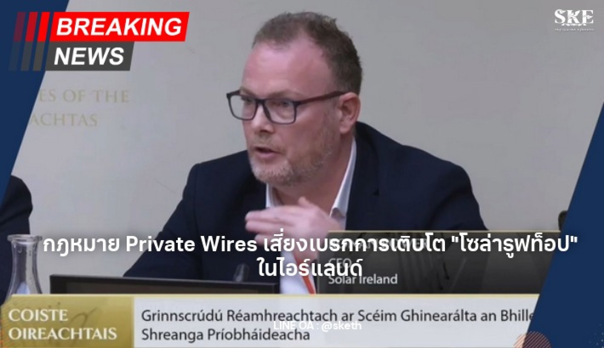 Ronan Power ซีอีโอของ Solar Ireland ได้เข้าชี้แจงต่อคณะกรรมาธิการร่วมด้านสภาพภูมิอากาศและพลังงานในรัฐสภาไอร์แลนด์ เพื่อแสดงความกังวลว่า การเติบโตอย่างก้าวกระโดดของการติดตั้งโซล่าเซลล์ภาคครัวเรือน (Residential Rooftop PV) อาจต้องสะดุดลงโดยไม่ได้ตั้งใจจากร่างกฎหมายฉบับใหม่ที่เรียกว่า "Private Wires Bill"